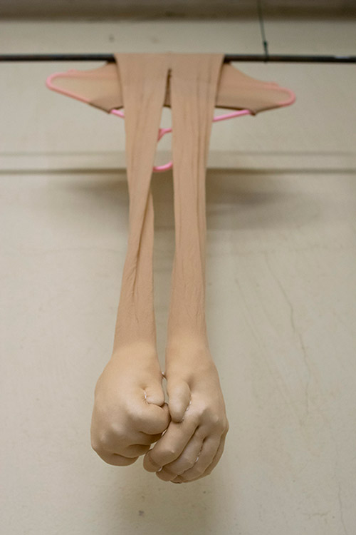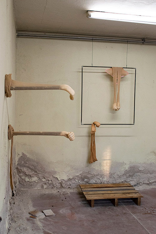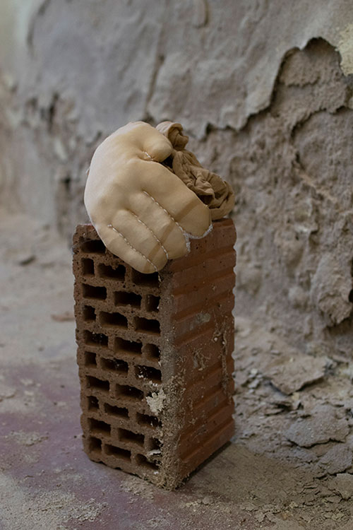 2020 // cosmetic folss, sheer tights, steel and rubble // Installation
